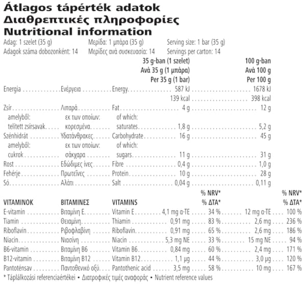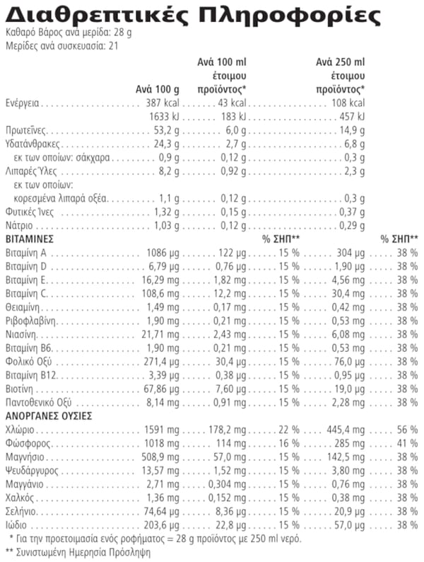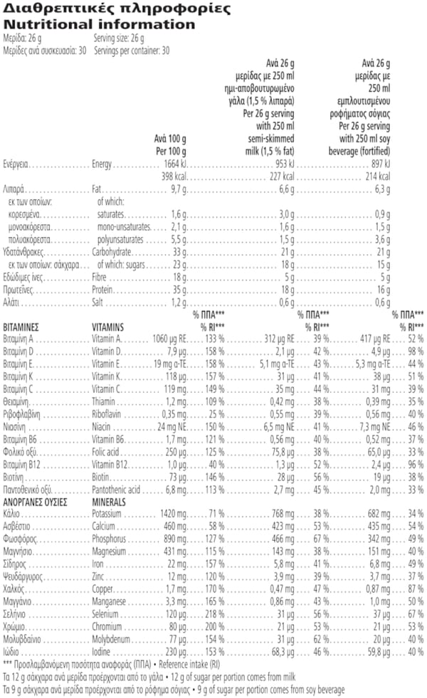 Isolated soy protein, fructose, inulin, gluten -free oat fiber, soybean oil, mixture of metal (calcium citrate, magnesium oxide, fumine iron, sodium lunar, zinc oxide potassium phosphate, emulsifier (soy lecithin), organic linseed powder, dense means (Xanthanis gum, gum gouvar), natural aromatic matter, vitamin mixture (L-Ascorbic acid (Vit D-Pantotheartic Calcium (Pantothenic Acid), Cholecalciferol (Vit.D), Pterohallumutic acid (fluffy acid), phylloquinone (Vit. K), pyridoxine hydrochloride (Vit. B6), thiamine hydrochloride (Vit. B1), cyanocobalamin (Vit. B12), Riboflavin (Vit. B2) (steviolis glycosites), papaya powder, parsley powder, bilberry powder, pomegranate powder, Antipostatic (silicon dioxide). Natural sweeteners.